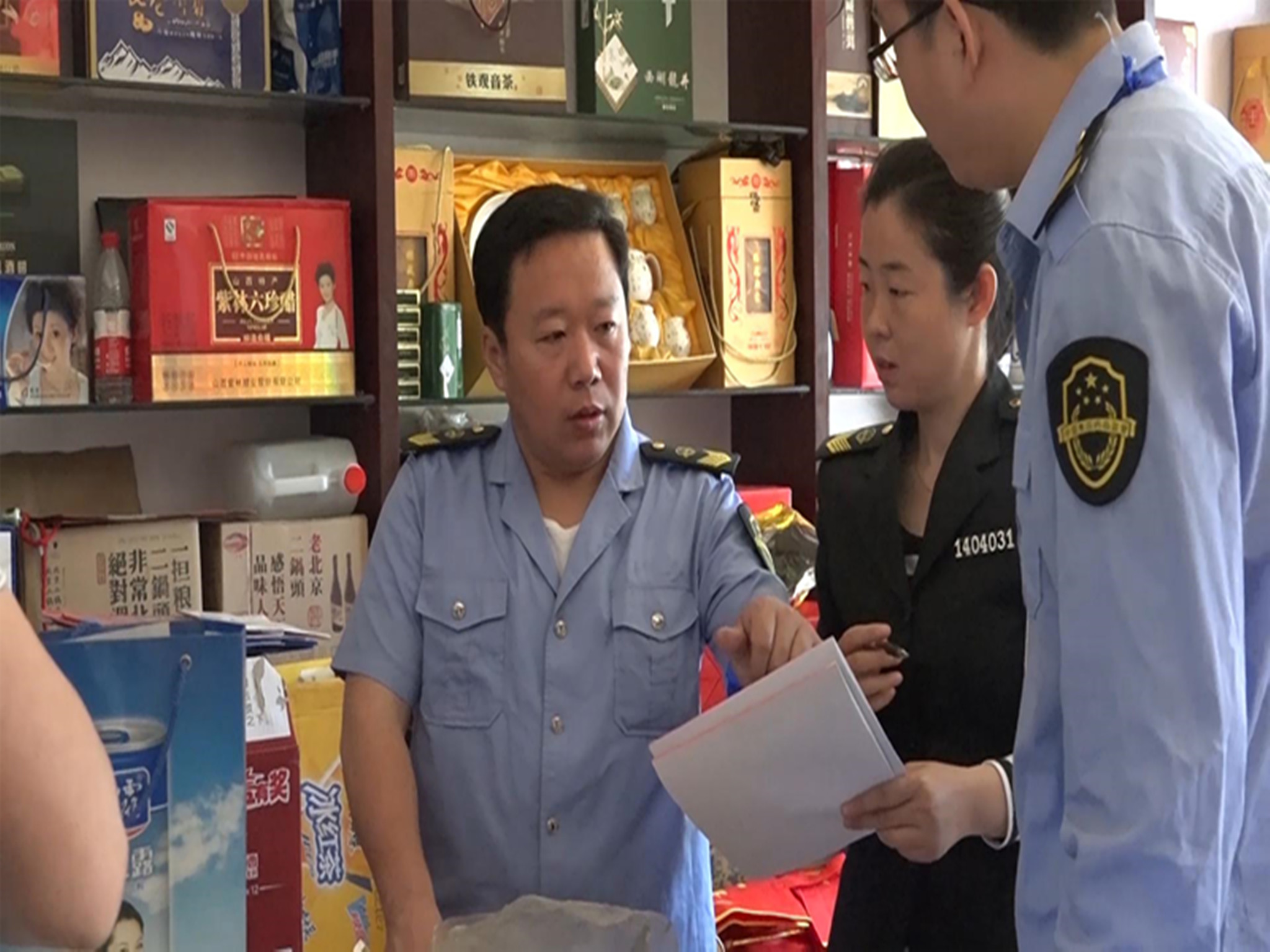 图十:古交市食药监局执法人员认真检查商店台账及索证索票情况。